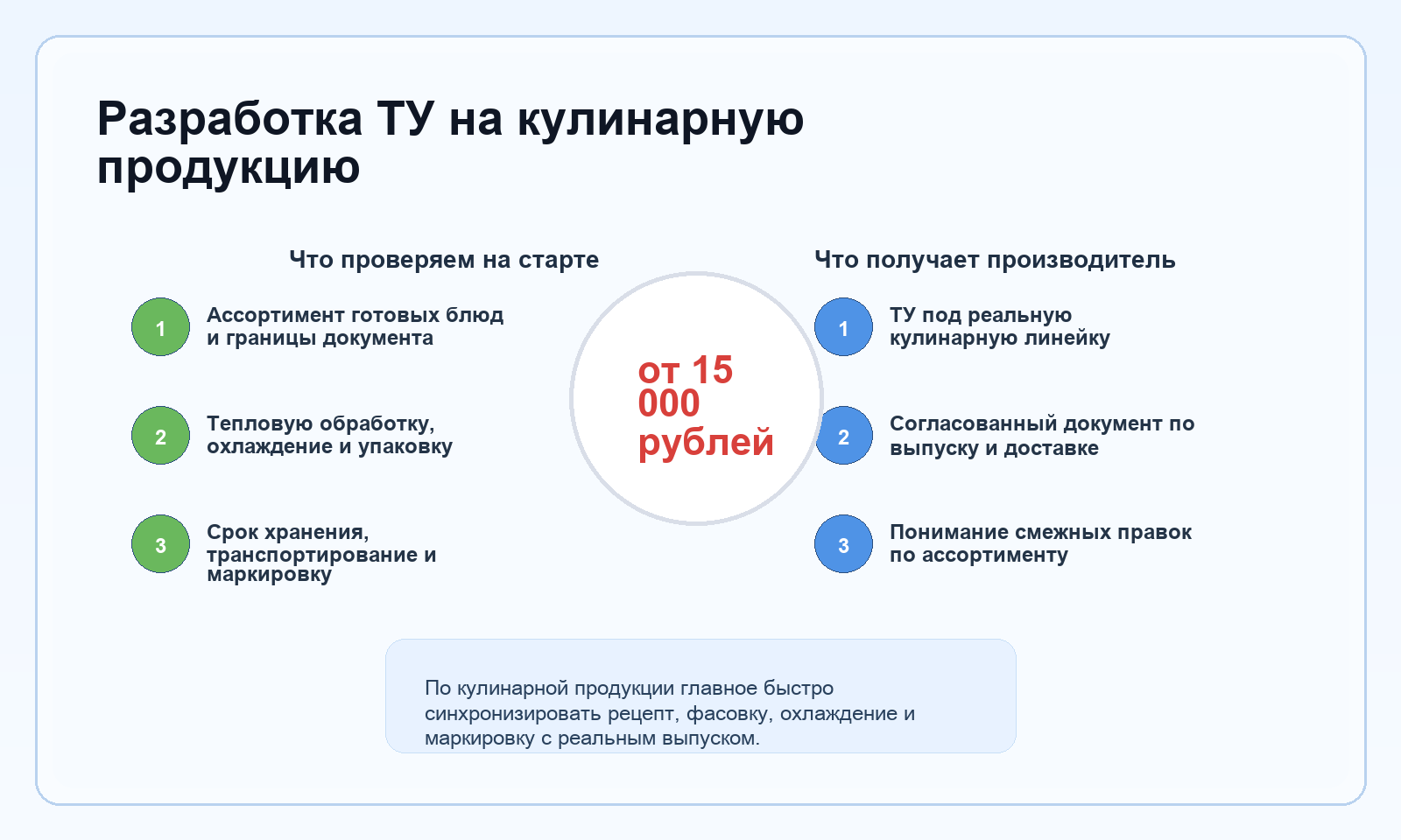 У кулинарной продукции главный вопрос не "из чего блюдо сделано", а "по какому каналу оно доходит до покупателя". Одна и та же позиция может идти в зал, в доставку, на витрину или в заморозку, и каждый из этих сценариев меняет то, как должно выглядеть техническое условие. Если это не развести, документ быстро начнет спорить с реальной продажей.
