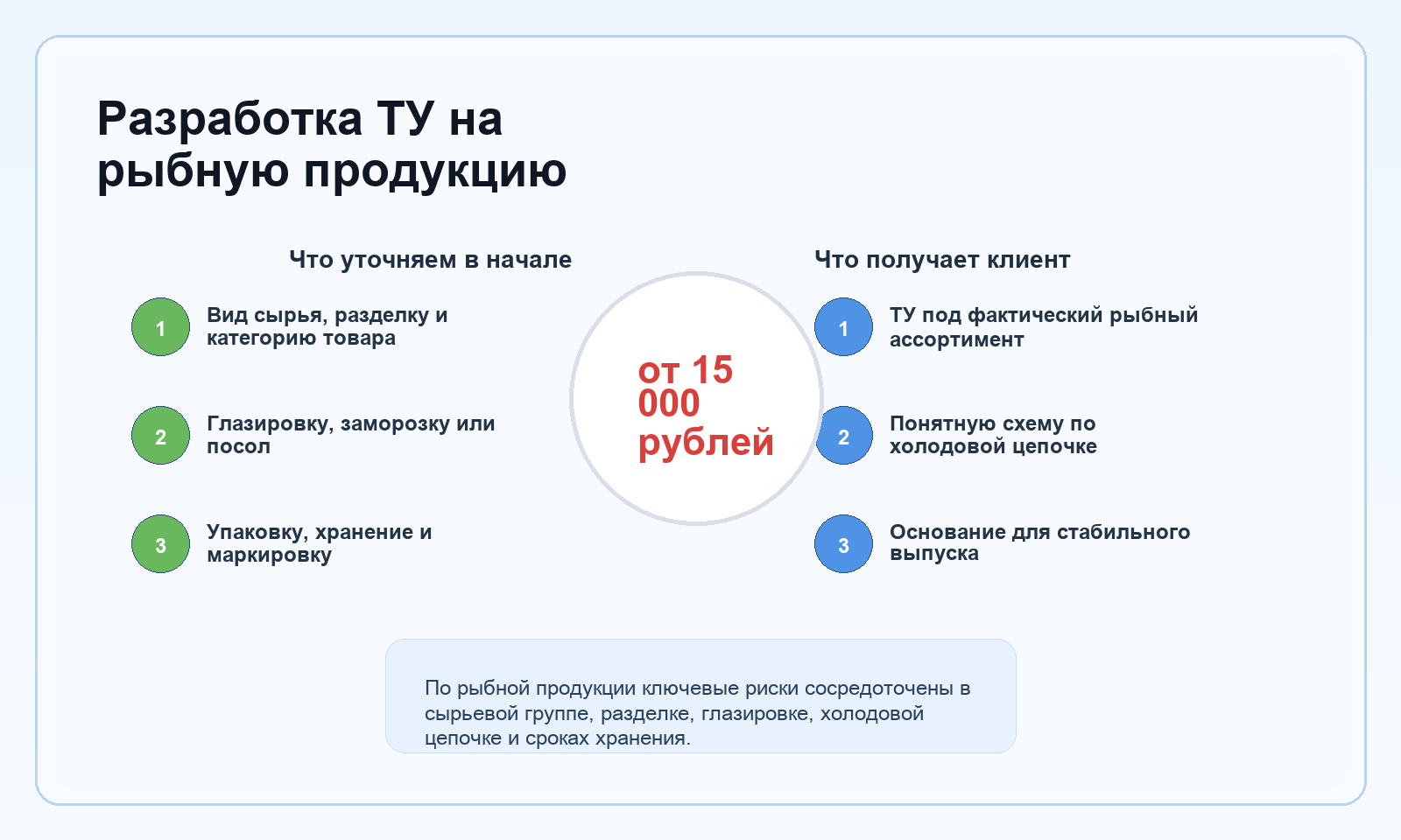 По рыбной продукции проблема часто обнаруживается не в самом тексте ТУ, а на пересечении нескольких документов. Например, в маркировке указана одна логика товара, а в техническом описании уже другая. Или в этикетке отражена глазурь, но в проекте ТУ этот блок описан слишком размыто.